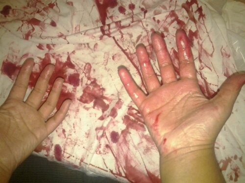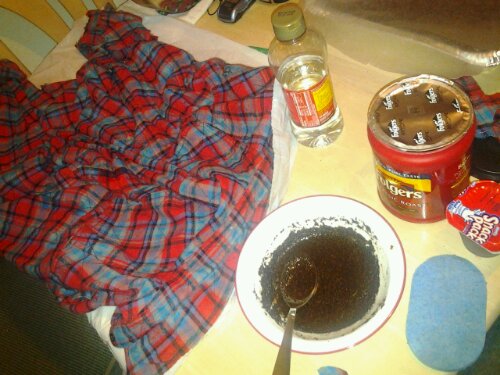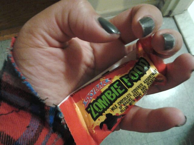 My wardrobe consisted of a flannel shirt that I ripped and tore up, and then poured fake blood and coffee grains (blood & dirt) all over it, making it seem like I put up quite the zombie fight what with “rising from the dead” and all. Under the flannel shirt I wore an old white t-shirt that was covered, and i mean covered in fake blood, and a pair of old beat up skinny jeans and moccasins. Whatever she was a hipster zombie girl… those exist 😉