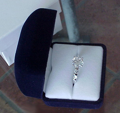 He pulls out a small blue velvet ring box and opens it, showing off a sparkly diamond ring.